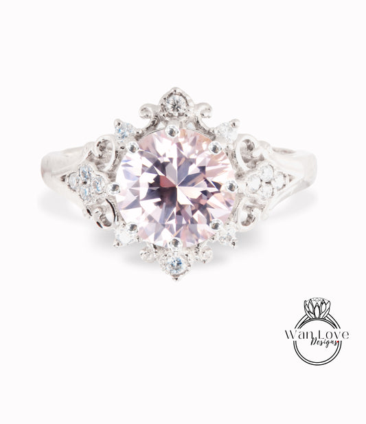 Light Pink Sapphire & Diamonds Ornate Floral Quatrefoil Engagement Ring, Round Antique Custom Vintage Bridal Wedding ring, Anniversary Gift