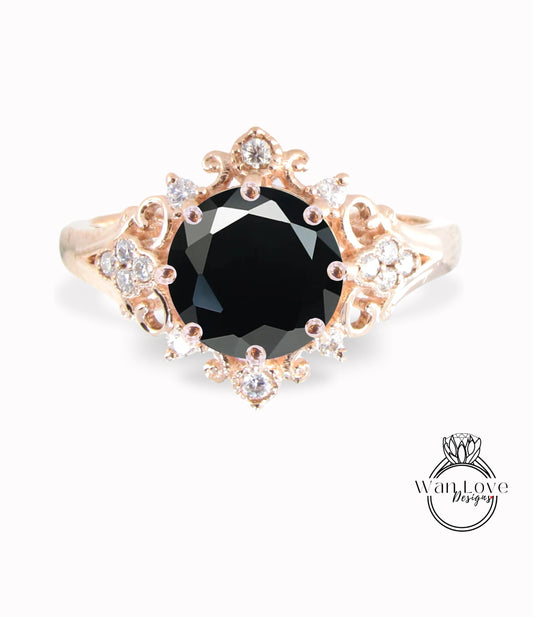 Black Moissanite & Diamonds Ornate Floral Quatrefoil Engagement Ring, Round Antique Custom Vintage Bridal Wedding ring, Anniversary Gift