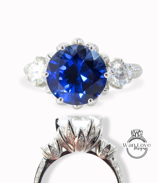 Blue Sapphire & Diamond Lotus Flower 3 gemstone Engagement Ring, 14k 18k White Yellow Rose Gold-Platinum-Custom-Three gem stone Bridal Wedding Ring-Anniversary Gift