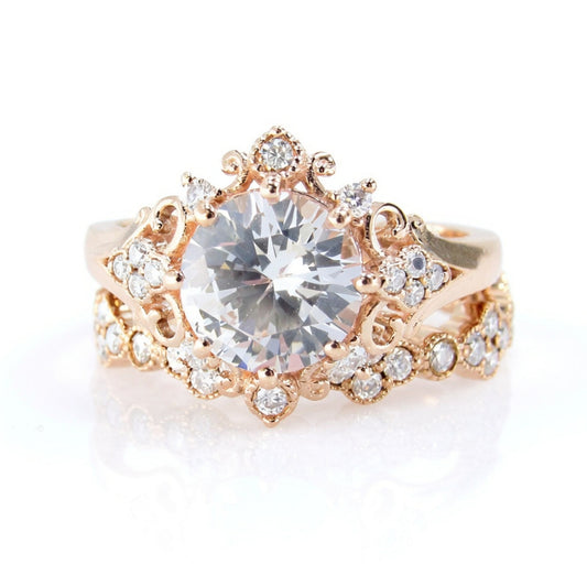White Sapphire Moissanite Engagement Ring Floral Quatrefoil Ornate Round Wedding Band Set 2ct-8mm-Rose gold-Custom-Gift-Ready to Ship