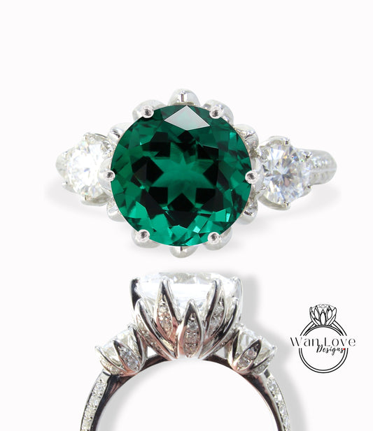 Emerald & Diamond Lotus Flower 3 gemstone Engagement Ring, 14k 18k White Yellow Rose Gold-Platinum-Custom-Three gem stone Bridal Wedding Ring-Anniversary Gift