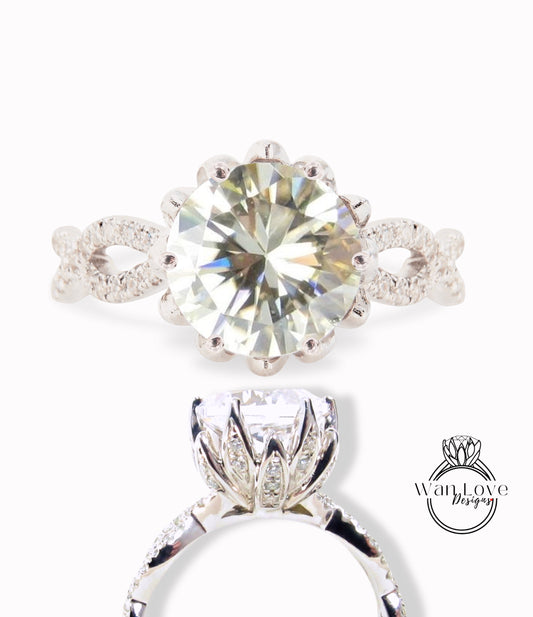 Grey Moissanite & Diamond Lotus Flower Infinity Twisted Round Engagement Ring, 14kt 18kt Gold-Platinum-Custom-Wedding ring-Anniversary Gift