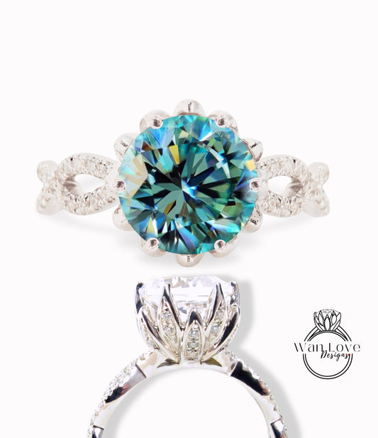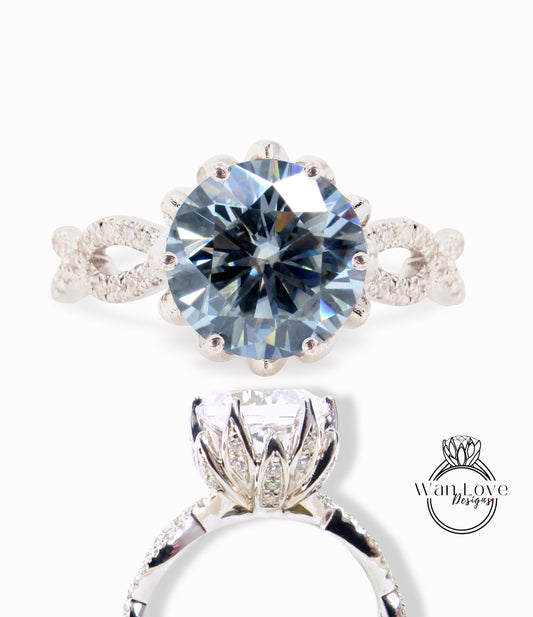 Blue Moissanite & Diamond Lotus Flower Infinity Twisted Round Engagement Ring, 14kt 18kt Gold-Platinum-Custom-Wedding ring-Anniversary Gift