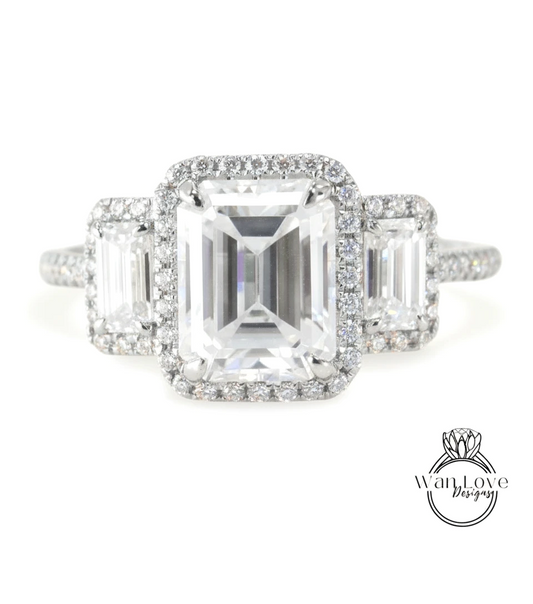 Diamond Emerald cut 3 sided Band Celebrity Style Engagement Ring Custom 14k 18k White Yellow Rose Gold Platinum Wedding Anniversary Bridal Gift