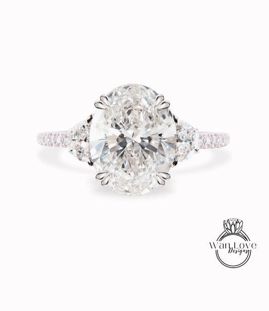 Diamond Engagement Ring Oval Half Moon 3 Gem Stone 14k 18k White Yellow Rose Gold, Platinum, Custom Genuine IGI Lab Created Diamond Ring