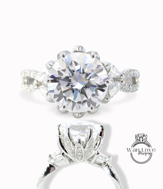 Diamond Lotus Flower Marquise Leaf Split Shank Engagement Ring, 14k 18k White Yellow Rose Gold-Custom,Gift Genuine Lab Created Diamond Ring