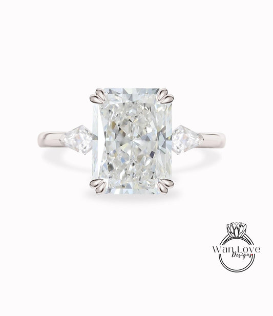 Radiant diamond engagement ring, Radiant cut diamond ring with side kite diamonds, three stone ring, wedding Bridal ring, Anniversary gift