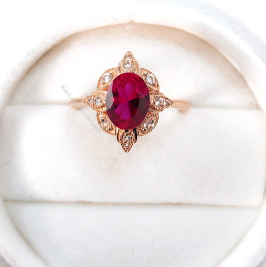 Vintage Ruby engagement ring rose gold round halo ruby ring art deco diamond halo ring wedding Bridal ring Anniversary promise ring