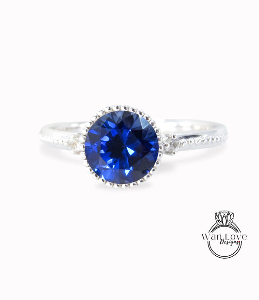 Blue Sapphire Round Diamond Ring, Round Cut Sapphire Ring in Milgrain Bezel Setting, 3 Gem Stone Round Engagement Ring