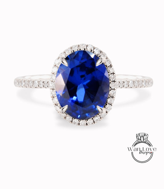 Oval cut Blue Sapphire engagement ring art deco ring halo moissanite/diamond ring vintage rose gold half eternity anniversary bridal ring