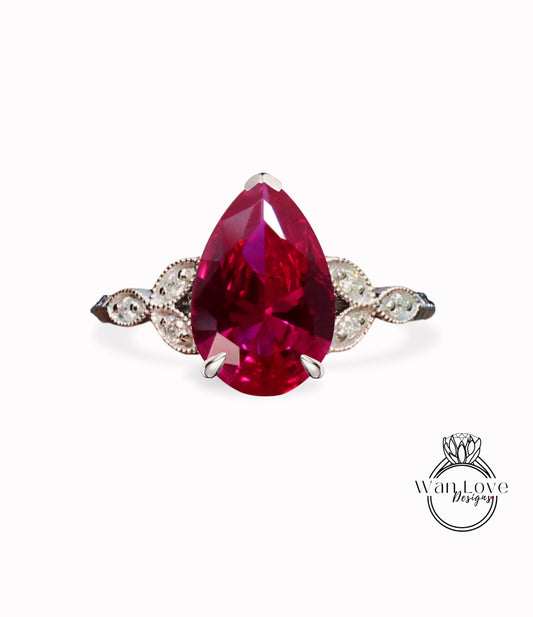Ruby & Diamond Pear Leaf Antique Cluster Engagement Ring Engraved Milgrain or Smooth 14kt 18kt Gold Platinum Custom Wedding