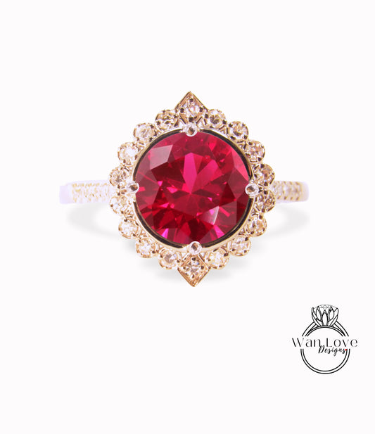 Ruby & Diamond Geometric Halo Round Engagement Ring, Custom, 14k 18k White Yellow Rose Gold-Platinum-Wedding, Anniversary Gift