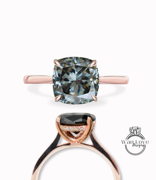 Gray Moissanite & Diamond Cushion Side Halo plain tapered band Engagement Ring, Cushion hidden Halo Diamond Moissanite Ring, Grey Engagement Diamond Ring, Anniversary Gift