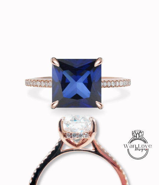 Blue Sapphire & Diamond Side Halo Princess Engagement Ring, 3/4 Almost Eternity, Custom, Square, 14kt 18kt Gold, Platinum, Anniversary Gift