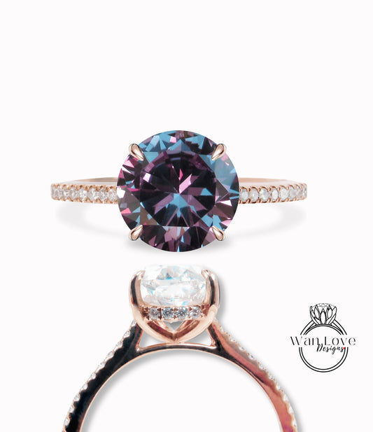 Purple Color Change Alexandrite Color Sapphire & Diamond prongs Basket Round Engagement Ring, Side Halo, Hidden, 3/4 Almost Eternity, Custom, Wedding, Anniversary