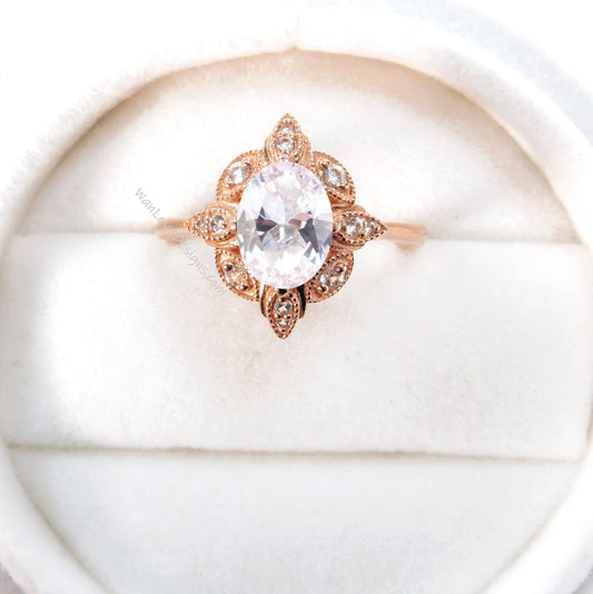 Oval Light Pink Sapphire engagement ring art deco rose gold moissanite diamond anniversary ring vintage halo unique anniversary bridal ring