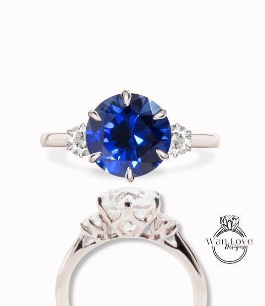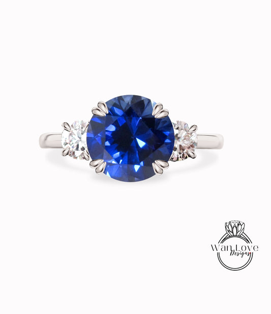Blue Sapphire & Diamond round 3 Gem stone Engagement Ring 14k 18k White Yellow Rose Gold-Platinum-Custom three gemstone moissanite diamond bridal wedding ring Anniversary Gift