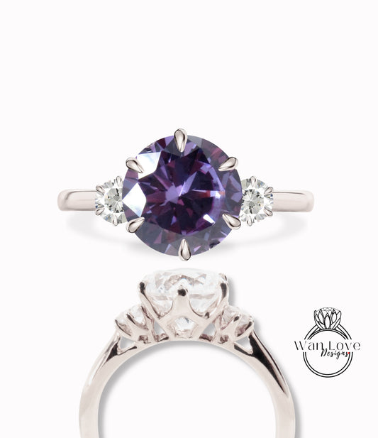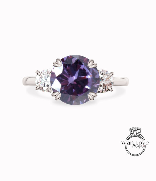 Purple Sapphire Alexandrite Color & Diamond round 3 Gem stone Engagement Ring 14k 18k White Yellow Rose Gold-Platinum-Custom three gemstone moissanite diamond bridal wedding ring Anniversary Gift