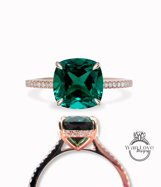 Emerald & Diamond Elongated Cushion Engagement Ring, Side Halo Ring, Long Cushion cut ring, Plain tapered band shank ring, Custom, Bridal Wedding ring Anniversary Gift