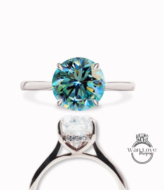 Teal Blue Green Moissanite & Diamond Round side halo plain band Engagement Ring, Cathedral Basket 14kt 18kt Gold-Platinum-Custom-Wedding, Anniversary Gift