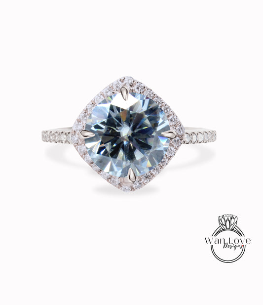 Gray Moissanite & Diamond Kite Cushion Halo Thin Dainty Pave Engagement Ring, NSEW Compass prongs, 14kt 18kt Gold, Platinum, Custom, Wedding