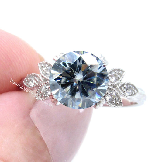 Round cut Grey Moissanite Diamond Milgrain Leaf Engagement Ring Nature Antique leaf Wedding ring Vintag Ring wedding bridal antique ring