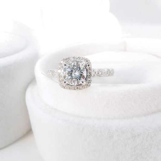 Cushion Halo Forever One Round Moissanite engagement ring 18k white gold vintage milgrain 3/4 eternity women Diamond Wedding Bridal Ready