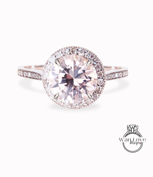 Diamond Halo Gold Ring/ Round Light Pink Sapphire Center Ring/ Engagement Ring/ Anniversary Ring/ Promise Ring/ Halo Milgrain Ring