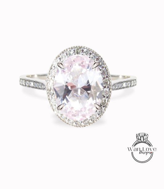 Light Pink Sapphire Diamond 14k gold milgrain oval halo engagement ring, sapphire gold engagement ring, gold milgrain ring, vintage inspired
