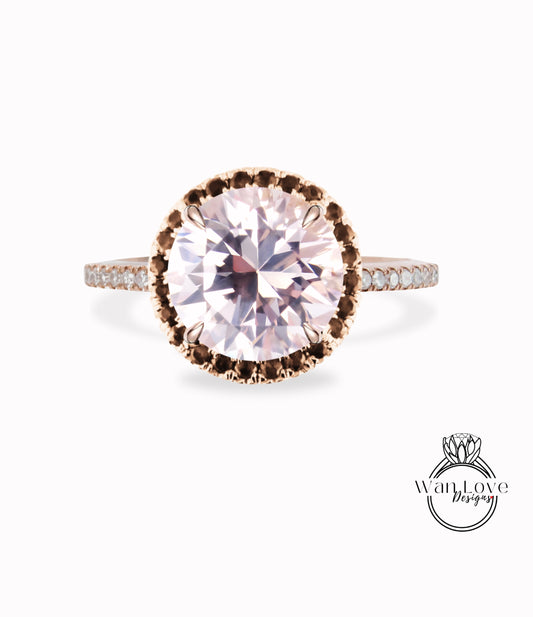 Light Pink Sapphire & Black Diamonds Round Halo Engagement Ring, Custom, 14k 18k White Yellow Rose Gold,Platinum,Wedding,Aniversary Gift