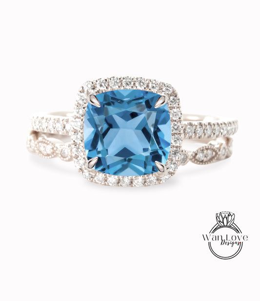 Aquamarine Blue Spinel & Diamond Cushion Halo Engagement Ring, Milgrain Leaf Wedding Band Set, 14k 18k White Yellow Rose Gold-Custom