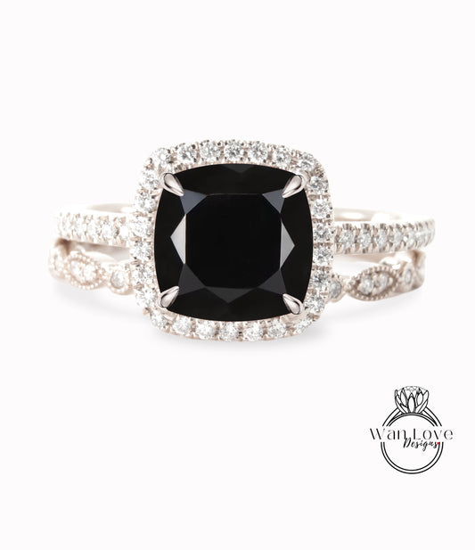 Black Spinel & Diamond Halo Engagement Ring Set, Full Eternity Leaf Wedding Band, 14k 18k White Yellow Rose Gold-Platinum-Custom