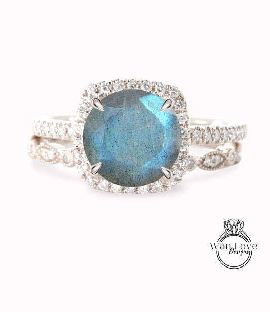 Labradorite & Diamond Halo Engagement Ring Set, Full Eternity Leaf Wedding Band Ring, 14k 18k White Yellow Rose Gold-Platinum-Custom
