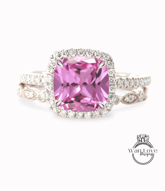 Pink Sapphire & Diamond Cushion Halo Engagement Ring Set Wedding Band 14k 18k White Yellow Rose Gold-Platinum-Custom-Anniversary-Round