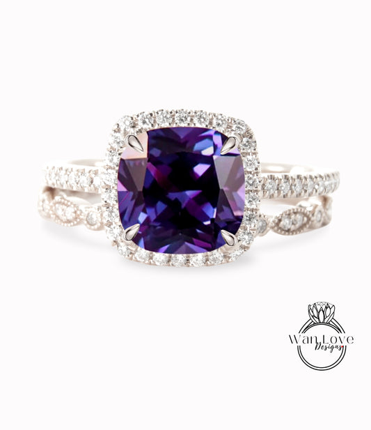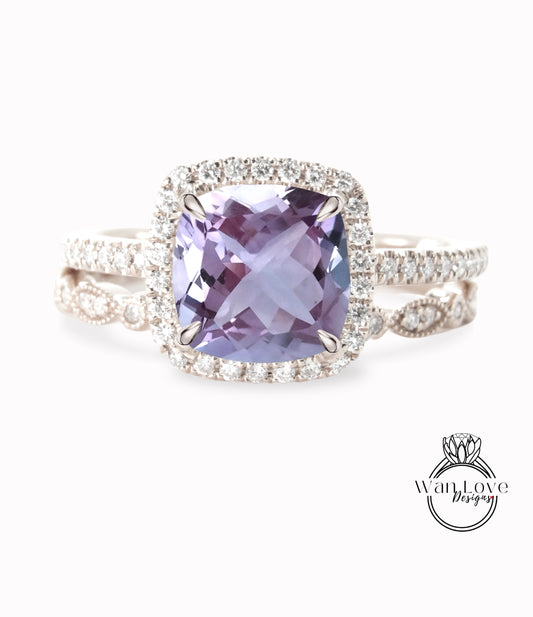 Purple Sapphire Alexandrite Color & Diamond Cushion Halo Engagement Ring Set, Wedding Band, Round, Custom,14k White Yellow Rose Gold