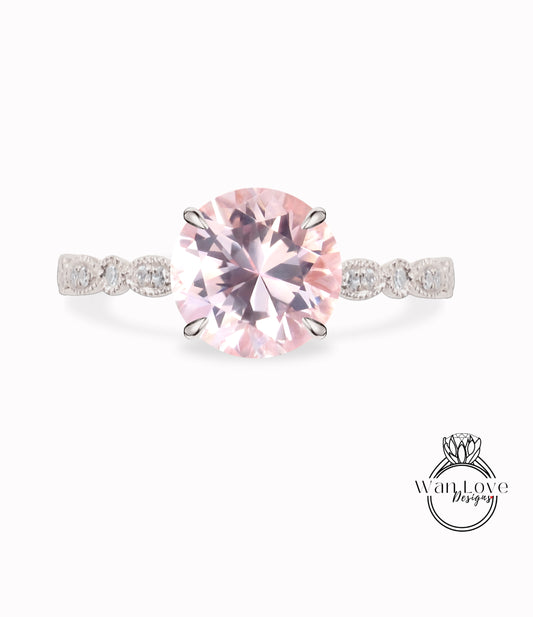 Round Peach Sapphire Ring Vintage Solid Rose Gold Engagement Ring scalloped Diamond Wedding Ring Art Deco milgrain Promise Ring