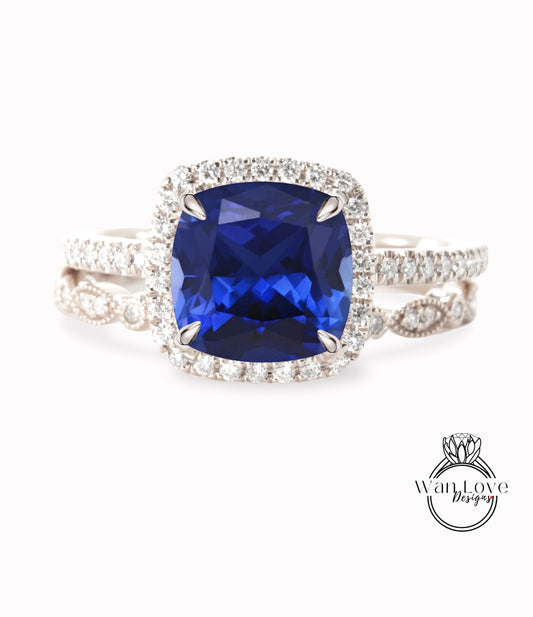 Blue Sapphire & Diamond Cushion Halo Engagement Ring, Milgrain Leaf Wedding Band Set, 14k 18k White Yellow Rose Gold-Platinum-Custom