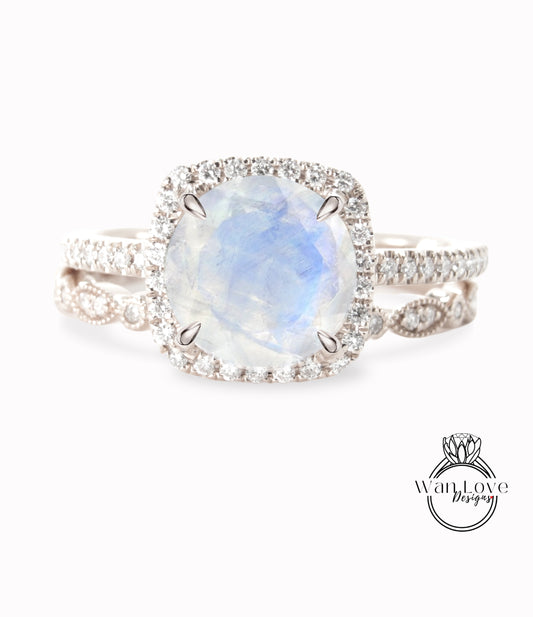 Moonstone & Diamond Cushion Halo Engagement Ring,Milgrain Leaf Wedding Band Set,Round, 14k 18k White Yellow Rose Gold-Platinum-Custom