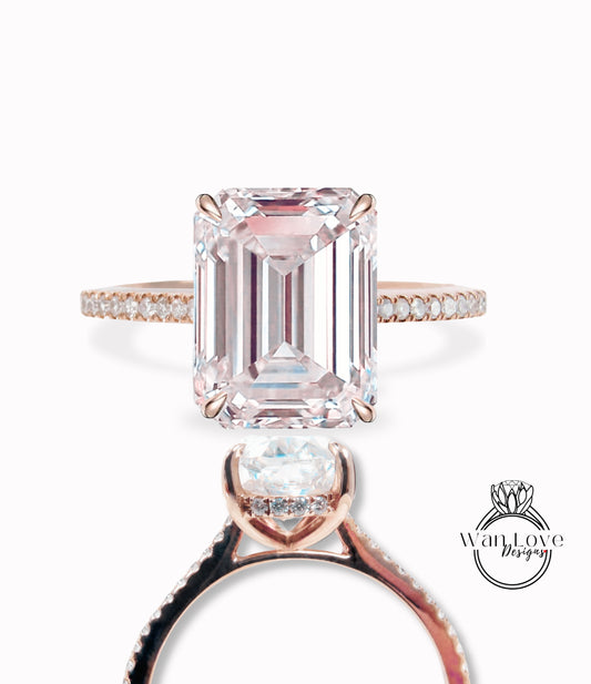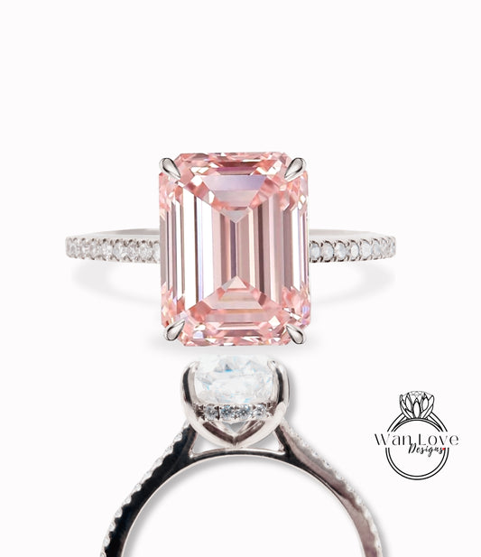 Light Pink Sapphire & Diamond Side Halo half halfway eternity Engagement Ring, Emerald cut Pave Rim wedding bridal ring 14kt 18kt Solid Gold Anniversary Gift