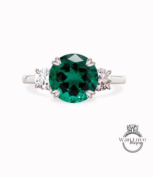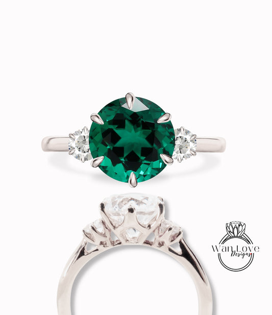 Emerald & Diamond 3 gem Stone Engagement Ring Round three gemstone ring 14k 18k White Yellow Rose Gold Platinum-Custom-Wedding Anniversary Gift