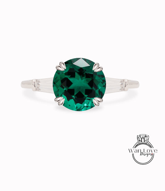 Emerald & Diamond Round Tapered Baguette 3 gem Engagement Ring, Custom Moissanite lab diamond 14k 18k White Yellow Rose Gold Platinum Wedding bridal ring, Anniversary gift