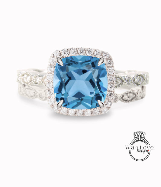 Aquamarine Spinel & Diamond Cushion Halo Engagement Ring Milgrain Round Leaf Wedding Band Set, Custom-14k White-Yellow-Rose Gold