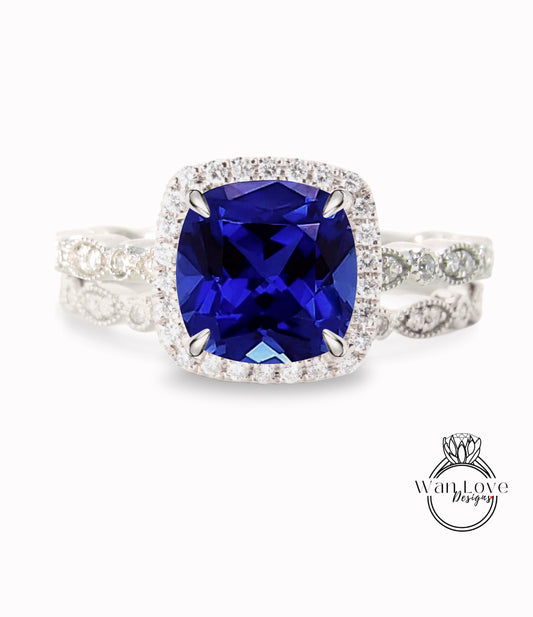 Blue Sapphire & Diamond Cushion Halo Engagement Ring set Milgrain Round Leaf Wedding Band Set vintage 14k 18k White Gold bridal anniversary