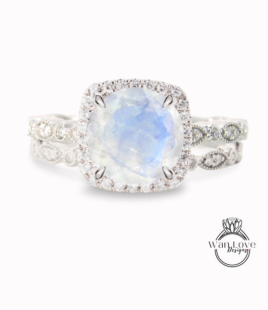 Moonstone & Diamond Cushion Halo Engagement Ring Milgrain Round Leaf Wedding Band Set, Custom-14k 18k White-Yellow-Rose Gold