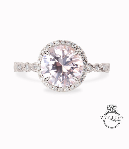 Light Pink Sapphire & Diamond Round Halo Scalloped Engagement Ring, Round Halo Moissanite Ring, Milgrain Vintage Sapphire Bridal Ring, Custom Rose gold Ring
