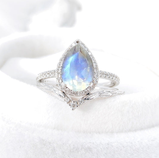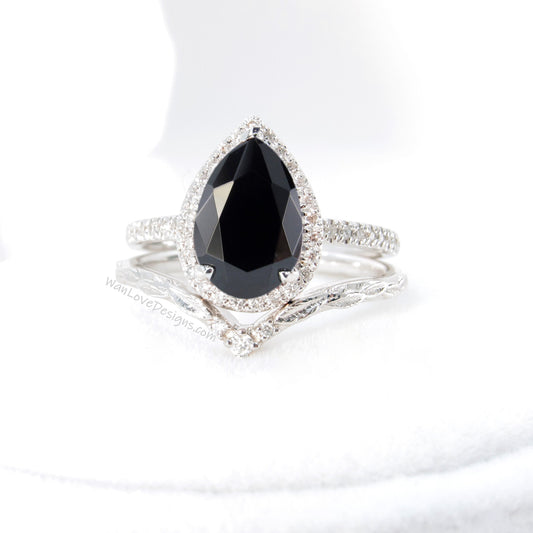 Pear halo white sapphire and diamond ring set, engagement ring and 7 gem wedding band, pear ring, diamond wedding ring, leaf engagement ring