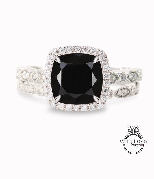 Black Spinel & Diamond Cushion Halo Engagement Ring Milgrain Round Leaf Wedding Band Set, Custom-14k 18 White-Yellow-Rose Gold