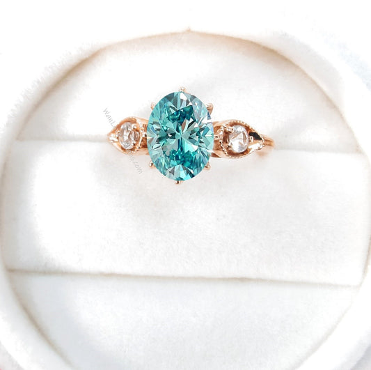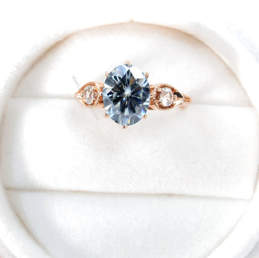 Blue Moissanite engagement ring vintage Oval milgrain ring Three gemstone round bridal ring art deco ring Promise Anniversary ring rose gold