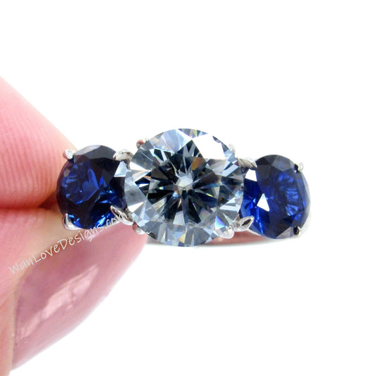 Grey Moissanite engagement ring vintage Blue Sapphire ring Three stone round bridal ring art deco ring Promise Anniversary ring solid gold