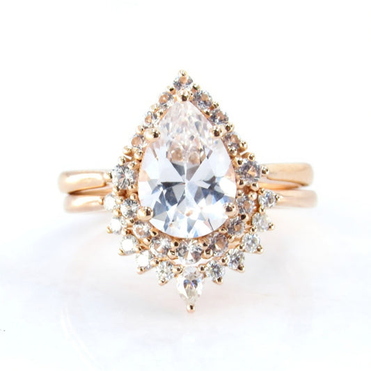 White Sapphire Pear Graduated Halo Engagement Ring Art deco Wedding Band Set 2ct vintage Rose gold pear halo bridal promise aniversary ring